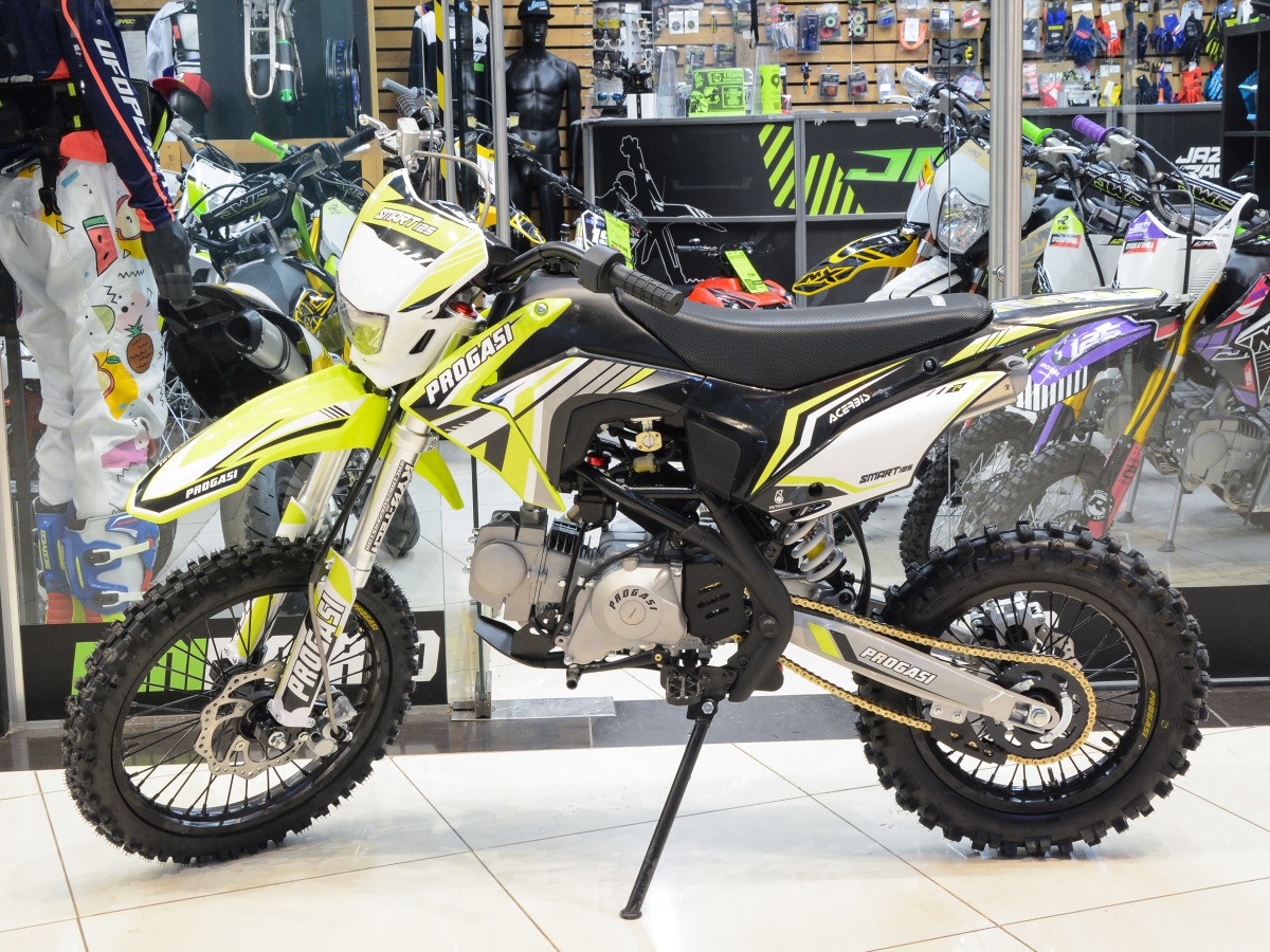 Progasi Smart, 2022 модельного года, представляет собой максимально доработанную версию уже зарекомендовавшего себя питбайка. Максимум мощности и максимум спортивности! Внимание к деталям заложено в ДНК этого Пита. Progasi Smart 125 имеет ту же платформу, что и его старший брат Smart 150, Рама сделана с упором на надежность и долгий срок службы. Все узлы качественно проварены, есть дополнительные усиления. На раму специально крепится пластиковый каркас, который защищает мотоботы и раму. Покрышки Kenda давно зарекомендовали себя в экстремальных видах спорта. Резина Kenda выдерживает закручивание шипов для катания зимой и отлично показывают себя на дёрте. Усиленные алюминиевые обода PROGASI с 36 спицами выдерживают максимальные нагрузки. Колеса также оборудованы буксаторами, они притягивают покрышку к ободу, не давая ей проворачиваться во время езды. Фирменное сиденье PROGASI, выполненное по технологии Acerbis anti-slip grip держит любого райдера как суперклей. Вы должны постараться, чтобы с него соскользнуть. Специальное ребристое водонепроницаемое покрытие позволит комфортно чувствовать себя в любых погодных условиях. В дождь сиденье не намокнет. Тормоза важнейший компонент питбайка, от которого напрямую зависит безопасность райдера, а также скорость прохождения поворотов. На всех моделях PROGASI установлены дополнительные расширительные бачки и армированные шланги тормозной системы для безупречного результата. Спереди установлена двухпоршневая тормозная система и однопоршневая - сзади. Многофункциональная приборная панель со спидометром, тахометром, одометром, индикатором передач и заряда батареи. Светодиодная фара последнего поколения выполнена по высшему стандарту, с ближним и дальним светом. Дополнительно в фару установлена ресничка в качестве дневного ходового огня. Брендированный алюминиевый глушитель PROGASI выполнен с сеткой без узкой флейты, как у полноразмерных кроссовых мотоциклов. Выхлопная система доработа. Добавлен Megabomb! Увеличена мощность c нижнего до среднего диапазона оборотов. Более "сочный" звук двигателя. Вся линейка мотоциклов Progasi комплектуется спортивной подвеской KYB-Tech. "Наша точность - ваше преимущество" - гласит слоган японской компании KYB. Choho выпускает мотоцепи имеющие специальное уплотнительное кольцо в конструкции. Данное кольцо, выполненное из твёрдой резины, располагается между внутренней и наружной пластинами роликовой цепи: она не пропускает пыль снаружи и задерживает смазку внутри. Таким образом, уплотнительное кольцо обеспечивает отсутствие чрезмерного растяжения, долгий срок службы цепи, которая не требует смазывания, а также отличается пониженным уровнем шума. Грязь и песок не задерживаются в механизме. Картер двигателя надежно защищен в случае обрыва цепи. Ваш байк готов к самым жестким условиям эксплуатации. Выбран оптимальный угол наклона. Повышена прочность на изгиб в полтора раза, в тоже время удалось сохранить пластичность металла: руль гнется, но не ломается. Усиленная конструкция защизает ручки от повреждений. Также использована геометрия легкого выжима. Незаменимый элемент при использвании байка на крутых подъемах, а также в местах с различными препятствиями, для прохождения которых надо быстро откручивать ручку газа, не перехватывая руль и не теряя управление. Короткоходная ручка акселератора так